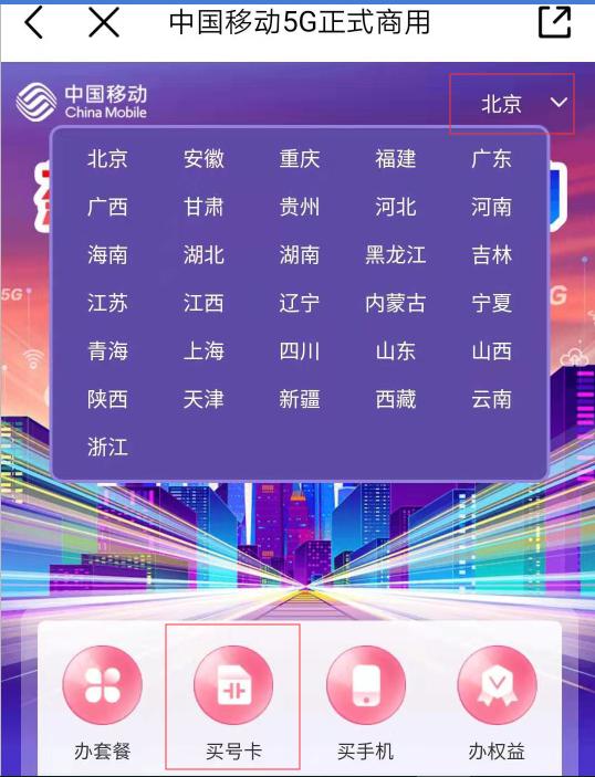 第二步:选择个人所在城市之后,点击"买号卡"就可以正式进入购买5G手机卡的界面。