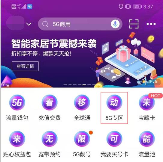 第一步:下载中国移动APP,并且进入首页"5G专区"界面。