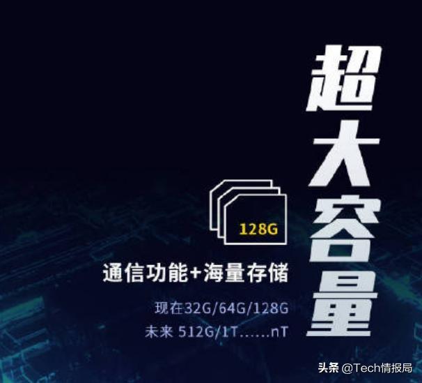 首先,这张 5G超级SIM卡同时兼顾内存卡和 SIM 卡两个功能。先给大家普及一个知识点,其实我们传统的SIM 卡也具备存储功能,但它存能力非常弱,通常只有64KB 或 128KB 。可想而知,这么一点点的空间完全不够用来存文件,只能用来存部分短信和联系人。而5G超级SIM的主要卖点就在于它,不仅保留了完整的通信功能, 甚至还加入了存储芯片,在存储容量方面是传统SIM卡的数十万倍。换句话说,这张卡完全可以用作一张内存卡,目前这张超级 SIM 卡有 32G、64G和128G 三种容量版本,但紫光集团表示,在未来 还会迭代出 512GB 或者 1T 的大容量版本。既是内存卡又是SIM 卡,还不多占据多余的卡槽,在手机内控空间十分珍贵的今天,可谓是一次颠覆性的突破!