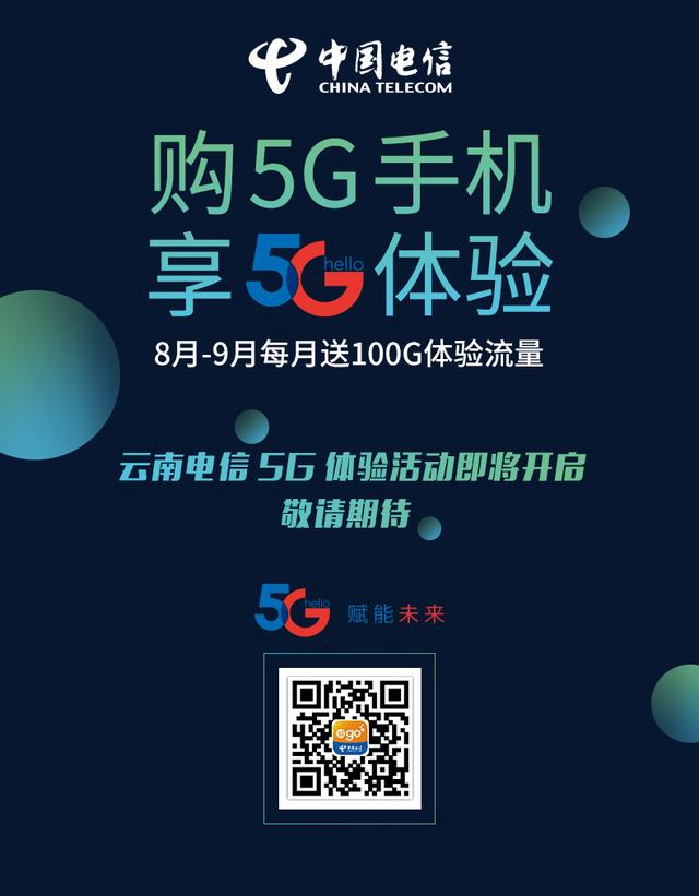 根据“5G体验活动”,8月至9月购买5G手机的中国电信客户,可免费领取5G体验包,每部手机、每张卡可领取1次。(流量有效期至2019年9月30日)