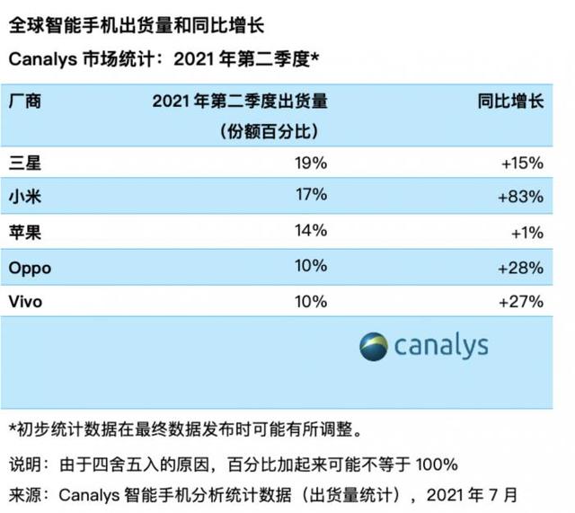 据Canalys的统计,2021年第二季度全球智能手机出货量增长12%,其中,三星手机的市场份额为19%,仍是全球第一。其次是小米以17%的份额位居第二,苹果14%的份额列第三,OPPO和vivo的份额同是10%,分列四五名。