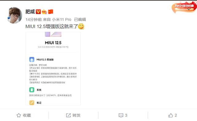 据微博博主 @肥威 称,小米手机 MIUI 12.5 增强版稳定版内测推送。