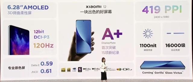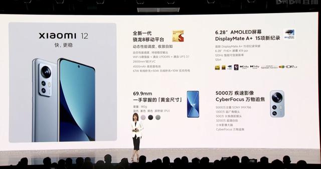 具体小米12:主打“小尺寸大升级”,参数有6.28英寸2400*1080分辨率AMOLED居中单挖孔柔性微曲面屏(华星光电独家供应),120Hz屏幕刷新率,最高480Hz触控采样率,支持DC调光,DisplayMate A+认证等,屏幕指纹。
