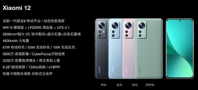 核心配置上,小米12搭载新骁龙8支持双模5G,WiFi6增强版+满血LPDDR5+满血UFS 3.1,2600mm² VC液冷散热面积,新一代钴酸高密度快充4500mAh电池,67W有线充电,支持50W无线充电,10W无线反向充电,X轴线性马达,哈曼卡顿调音对称双扬,支持多功能NFC、红外遥控等。