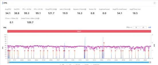 半小时原神平均帧率54.1,温度最热45.7℃。