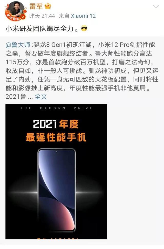 雷军转发了这条微博,并称小米团队竭尽全力。鲁大师表示,小米12 Pro剑指性能之巅,誓要做年度旗舰终结者。鲁大师性能跑分高达115万分,亦是首款跑分破百万机型。驯龙神功初成,但见又运足了内劲,任凭一身无可匹敌的天花板配置,同时将性能和影像推上新高度,年度性能最强手机非他莫属。2021鲁大师牛角尖奖年度“性能最强手机”,小米12Pro。