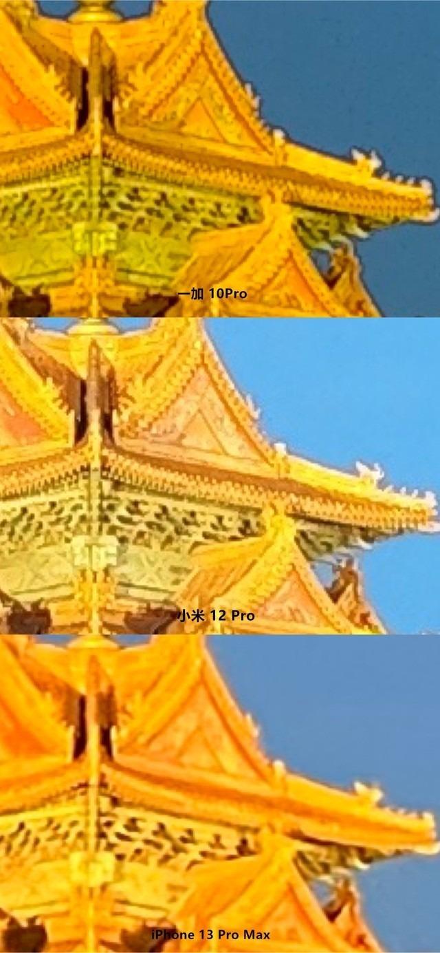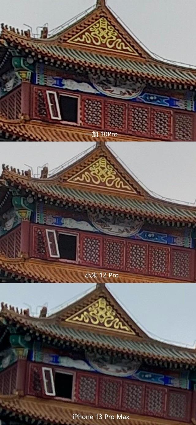 最后,是本张图片在细节方面的表现。iPhone13 ProMax由于像素不足,彻底丧失了解析画面的能力,糊成了一片。反观,一加10 Pro对画面没有过度锐化,没有针对拍不到的地方进行过度处理,更贴近真实情况。小米12 Pro则出现了之前强调的锐化过度的问题,拍不到的地方靠算力补齐,大幅降低画面舒适感。