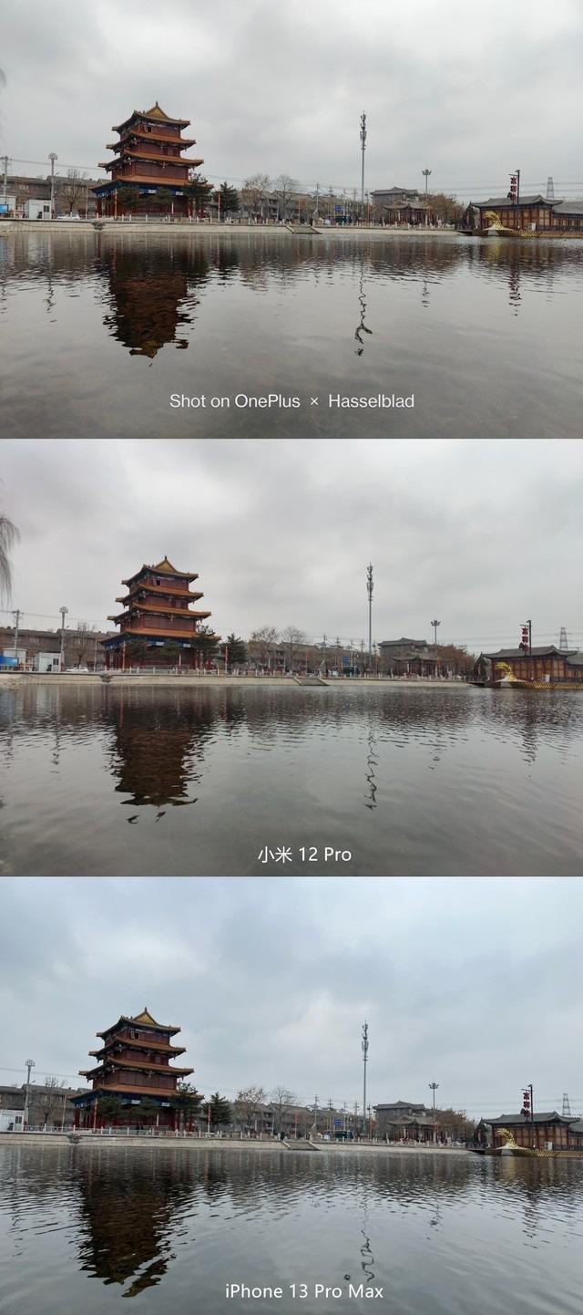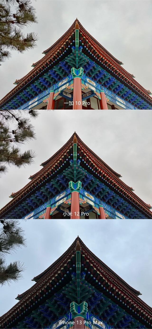 接下来是第二组样张,一眼看上去iPhone 13 Pro Max整体颜色偏暗,好像HDR并没有帮助它更好地合成图像,图像中丧失了部分细节。而一加 10Pro、小米12 Pro优化的都非常适中,天空的色彩非常真实,HDR功能也都及时的发挥了作用,但是12 Pro色彩对比对度并不明显,使得画面看起来偏暗,色彩失衡。一加 10Pro整体看上去更好。