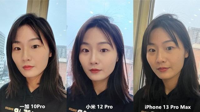 一加 10Pro、小米12 Pro均采用了3200万像素前置摄像头,iPhone 13 Pro Max前置为1200万像素。根据对比图,我们不难看出有了高像素的加持,一加10 Pro、小米12 Pro表现得都非常不错,不论是模特的发丝纹路,睫毛还是色彩都深度还原了当时场景,但一加10 Pro在保证真实的前提下没有出现优化过度的现象,不论是背景的虚化还是模特的气色都更接近实际。而小米为了突出人物主体,背景出现了严重曝光丧失了一定的观赏性。iPhone 13 Pro Max整体颜色偏白,由于像素不够高,照片放大后的清晰度也有所欠缺。
