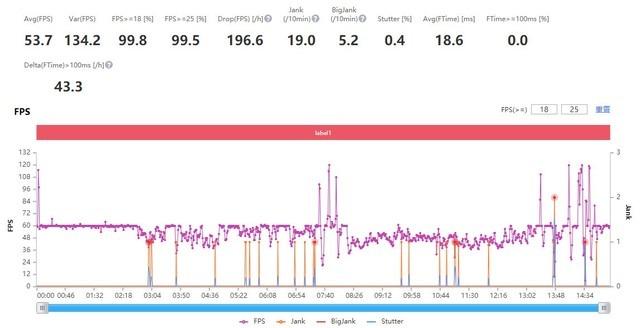 一加 10Pro在游戏实测中的表现仍然很优秀,在满帧60帧的情况下取得了58.7帧的成绩,几乎实现了满帧运行。通过帧率图,我们不难看出一加 10Pro在开局后十分钟非常稳定流畅的,虽然会发生间隔性掉帧,但并不会对游戏体验产生过多的影响。而在后五分钟,随着游戏时间的增加,帧率开始变得活跃起来,出现了不规则的跳动。