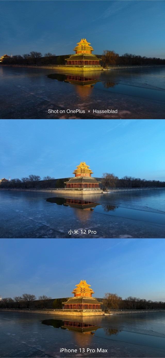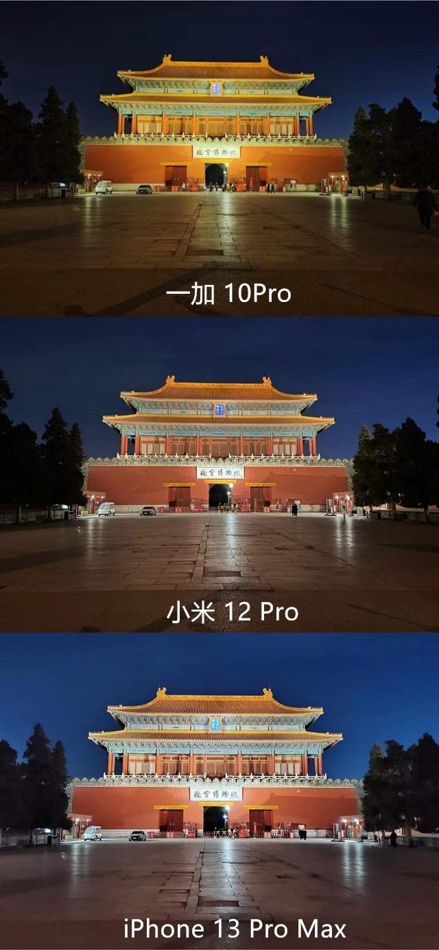 我们再来看看这三款手机的夜景表现如何。其次,小米12 Pro与iPhone13 ProMax在颜色的识别上是最优的,场景还原度最高,天空的色该更符合真实场景。而一加 10Pro画面整体偏暗,为了突出角楼主体降低了画面色彩。显然这三款手机在画面优化上各有取舍,大家可以根据自己的喜好来判断哪台手机拍出来的更适合自己。
