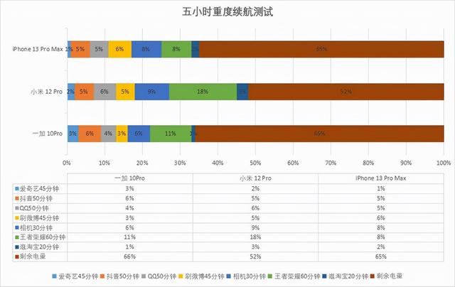 通过续航测试我们不难发现,一加 10Pro、iPhone13 ProMax的表现最好,在经历了五小时重度续航测试后,仍还剩余了65%、66%的电量。所以即便是搭载了大容量电池也不一定会有优质的续航体验,想拥有长续航更要关注机身整体的优化。之所以一加 10Pro、iPhone 13 Pro Max能拥有不错的续航体验,与它们所采用的的LTPO2.0、ProMotion技术密不可分,对屏幕智能合理管控,才是立足长续航的基础。