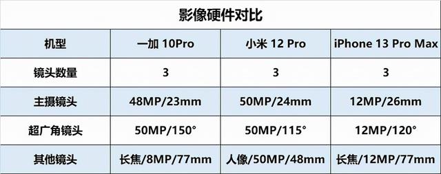 一加 10Pro、小米12 Pro、iPhone 13 Pro Max这三款机型不论是在影像系统的硬件方面还是软件方面各有各的优势,我们先来了解一下三款手机在硬件上的配置。