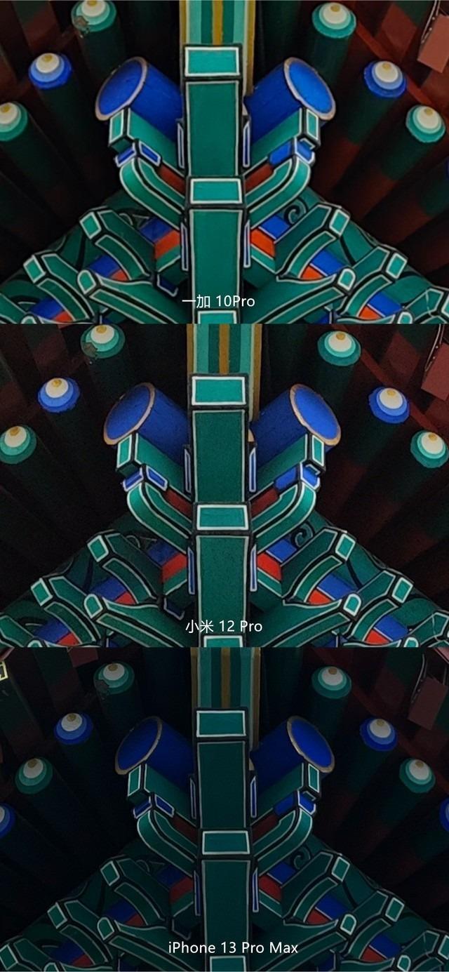 整体优秀不代表细节优秀,先来说说死黑的情况吧,一眼看上去小米12 Pro与iPhone13 ProMax都出现了大面积的死黑,无法辨认图片细节。一加 10Pro展现出了不错的宽容度,暗部细节没有被完全抹去。再来说说画面解析力,一加 10Pro画面解析力应数这三台手机中最好的,没有出现过度优化,边缘没有过于锐利,而其他两款手机白色线条的边缘太过锋利,虽然在一定程度上能增强立体感,但看起来并不真实。