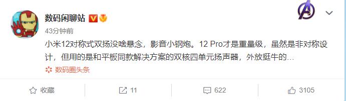 据微博博主 @数码闲聊站 称,小米 12 对称式双扬没悬念,影音小钢炮。小米 12 Pro 才是重量级,虽然是非对称设计,但用的是和平板电脑同款解决方案的双核四单元扬声器,外放挺牛的…