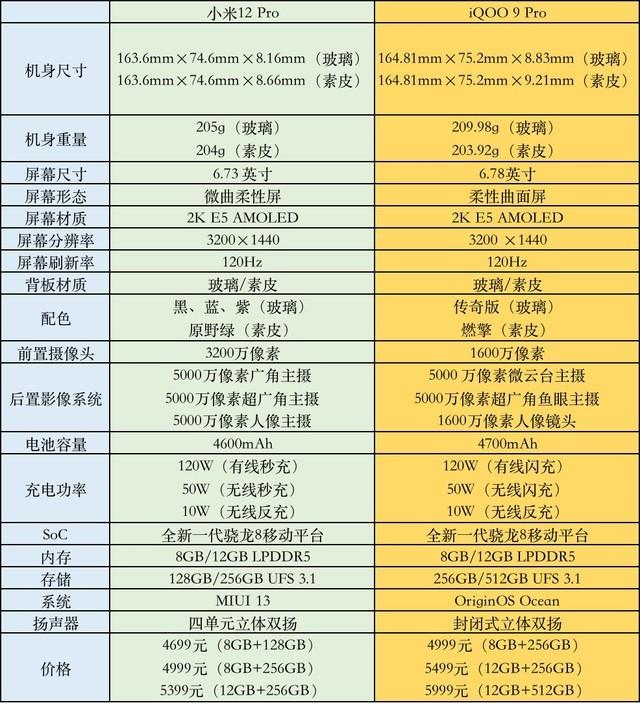 小米12 Pro vs iQOO 9 Pro 配置一览图