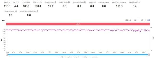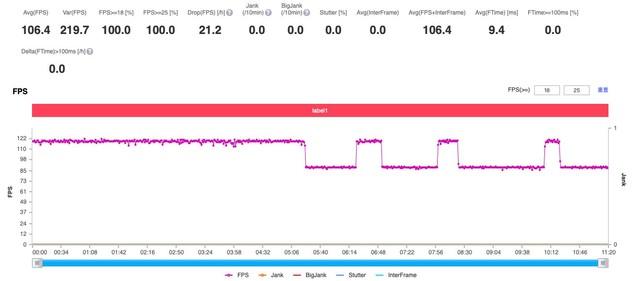 通过笔者对两款手机进行各10分钟的《王者荣耀》测试,我们可以看到iQOO 9 Pro的帧率高达118.3,而小米12 Pro因为出现了降频掉帧的情况,导致它的帧率只有106.4FPS。