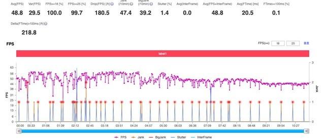 当我将iQOO 9 Pro开启帧率提升模式(插帧)后,虽然PerfDog记录到的帧数有所下降,但实际帧数已经提升到了90FPS(页面切换时,由于插帧,会产生帧率波动),不仅体验上让我感觉更为流畅,同时在激烈的战斗场景下,它也会相比于未开启插帧时,为我提供更为稳定、不卡顿的游戏状态。