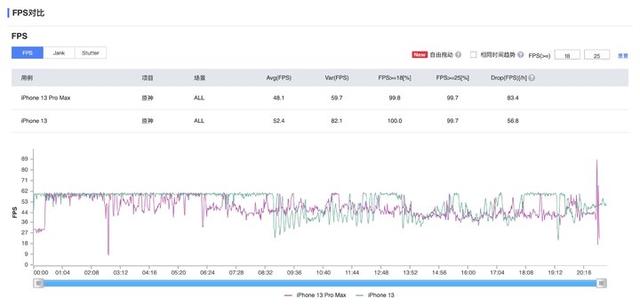 均在最高特效 60fps 帧率下进行 20 分钟游戏测试,两者前期表现差距相近,然而到了游戏中后期,iPhone 13 的帧率波动幅度比较大,而 13 Pro Max 的表现较为稳定,大部分时间都维持在 40fps 以上。