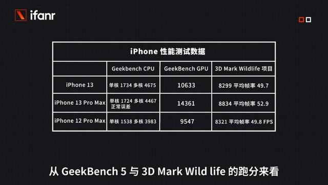 通过 GeekBench 5 与 3D Mark Wild Life 测试跑分来看,iPhone 13 与 13 Pro 的差距主要就体现在 GPU 上,CPU 表现相差无几。