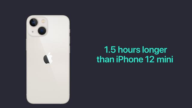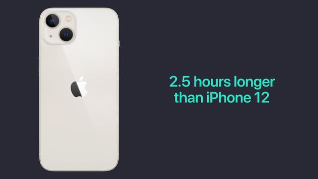 电池续航方面,iPhone 13 续航相比上代增加 2.5 小时,iPhone 13 mini 续航时间相比上代增加 1.5 小时。