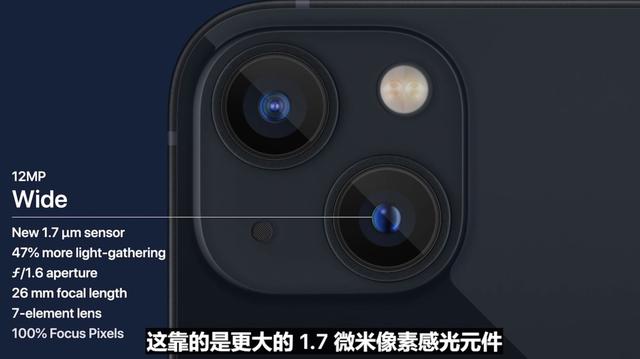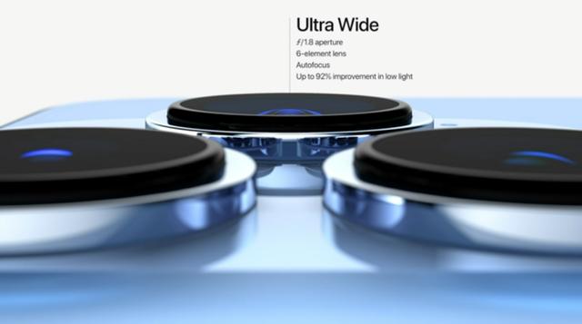 影像系统方面,iPhone 13 系列再升级,主摄采用 1200 万像素的广角镜头,f/1.6 光圈,1200 万像素的超广角镜头,120 度超广角,f/2.4 光圈。
