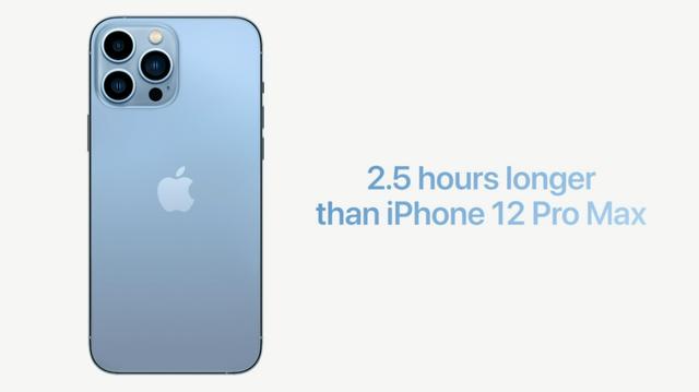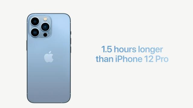 电池续航方面,iPhone 13 Pro Max 续航相比上代增加 2.5 小时,iPhone 13 Pro 续航时间相比上代增加 1.5 小时。