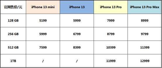 iPhone13128GB 5999元;256GB 6799元;512GB 8399元