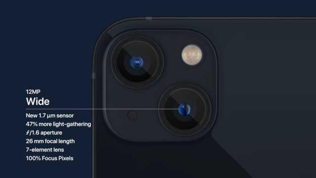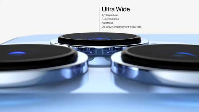 iPhone13Pro与iPhone13ProMax搭载了Pro级别的1200万像素摄像头系统(长焦,广角,超广角),长焦光圈为F2.8,广角光圈为F1.6和超广角的F1.8光圈和120°视角。支持3倍光学变焦(放大)以及0.5倍超广角光学变焦,既拥有6倍光学变焦距离,最高可达15倍数码变焦。在拍摄微距近物,细节拥有大幅度提升。