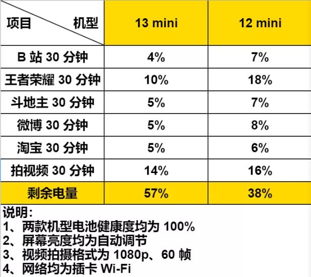 可以看出,13 mini 和 12 mini 在做完测试后,剩余电量差距很明显,达到了近 20%。