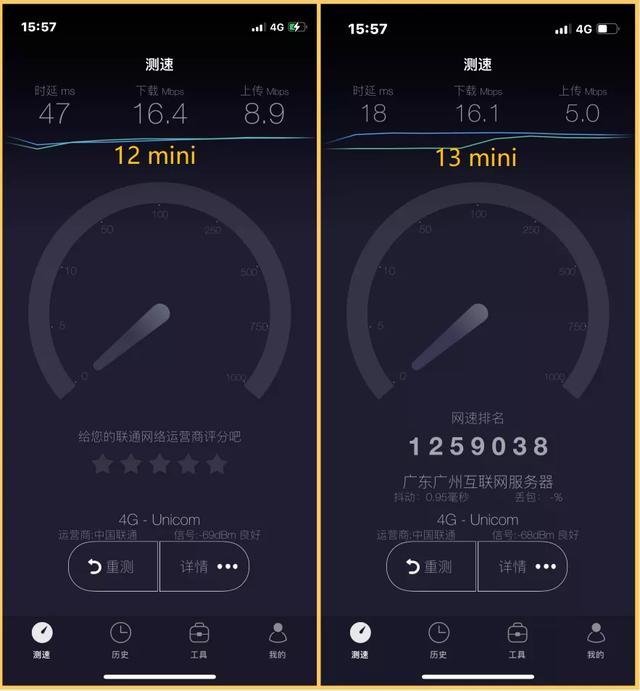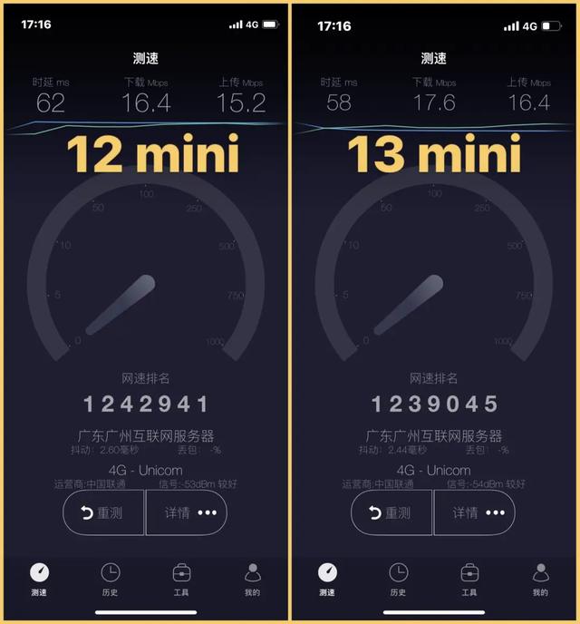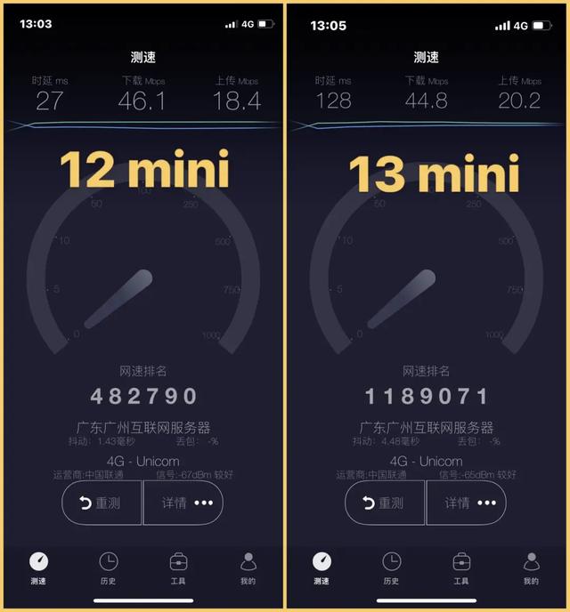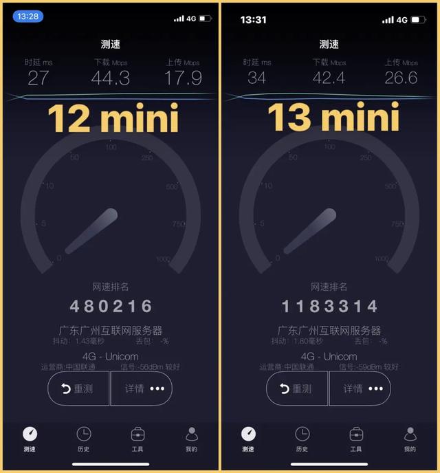家里的:信号强度(越高越好) 13 mini>12 mini,网络时延(越低越好) 13 mini>12 mini,网速基本一致~