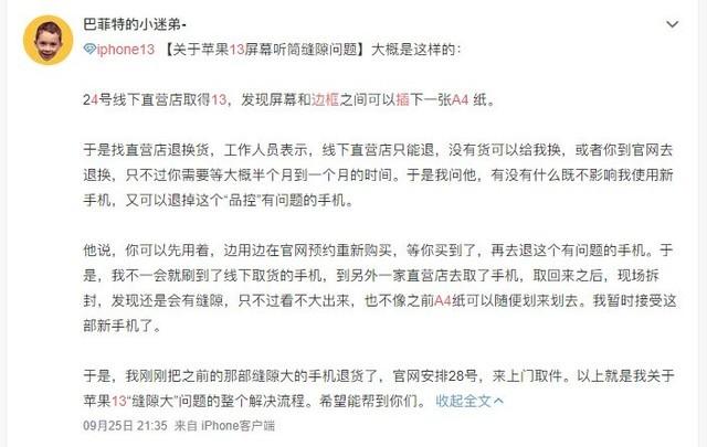 另外,iPhone 13系列新机还存在屏幕与边框衔接不严的问题,有网友反映其缝隙可以插入一张A4纸。其实这个问题在iPhone 12系列时就有用户遇到过,这个属于零部件公差造成的影响。