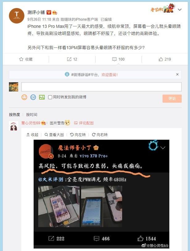 此外,有博主表示,“屏幕看一会儿就头晕眼睛疼”,原因可能是iPhone 13系列采用了低频率的PWM调光,部分用户对这种屏幕调光模式比较敏感。如果朋友们对其屏幕调光有所顾虑,建议去线下体验店亲自上手体验下。