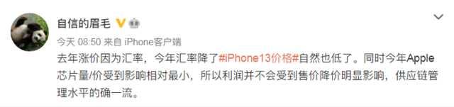 对于这个问题,手机业内人士沈义人在微博分享了自己的观点:“去年涨价因为汇率,今年汇率降了iPhone13价格自然也低了。”