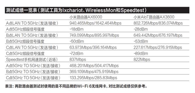 首先在“LAN TO 5GHz”模式下,距离路由器约1米的A点我们测得的无线接收速度高达1642.464Mbps,其发送速率也能达到940Mbps左右。下面我们来看看无线信号在穿墙之后的表现,首先在距离路由器约3米(间隔一堵墙)的B点,我们测得的接收速率逼近900Mbps,而在距离5米(间隔两堵墙)的C点,接收速率也能逼近400Mbps,同时信号强度也稳定在-72dBm。此外在“5GHz TO 5GHz”模式下,测试结果显示近场传输的速率在500Mbps左右,即使是C点的无线发送速率也能超过100Mbps。从我们的测试成绩来看,小米路由器AX6000的无线信号能够轻松覆盖面积接近120平方米的测试场地,并且在距离较远的位置,这款路由器也能提供可满足用户正常使用的网速。