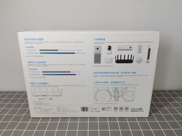 在包装盒的背面则主要介绍了一下这款产品的一些技术特点,包括:支持4X4 160MHz频宽,支持4K QAM技术,升级5G频段且搭载了2.5G高速网口。无线传输从1024 QAM升级到4096 QAM,支持全屋WIFI6信号全覆盖,接入米家APP后更是可以和众多米家智能设备畅快连等等。