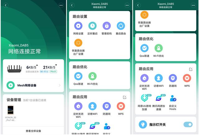 配置完成之后进入米家APP的路由器操作界面,拥有丰富的设置、优化、应用等功能。包括网络设置、定时重启、WiFi优化、访客WiFi、防蹭网等功能,操作起来很简单,这里就不给大家一一赘述了。此外它对于游戏应用的优化也是一大惊喜,随机附赠价值180元的游戏加速会员,可支持网易UU游戏加速、腾讯网游加速器,对目前的手游、电脑端游戏覆盖面积大,进一步提升了产品性价比。