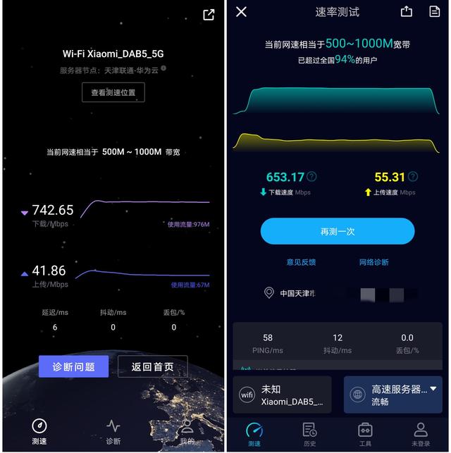 效果好不好还得看疗效,路飞家里的网络宽带为联通500M光纤,通过使用华为一键测速APP和Speedtest两款测试软件对其网速进行测量,其下载速率基本能稳定在700Mbps,上传速率在50Mbps左右,这个速度还是非常强悍的,比我之前的路由器下载速率起码高出一倍,网速提升显而易见。