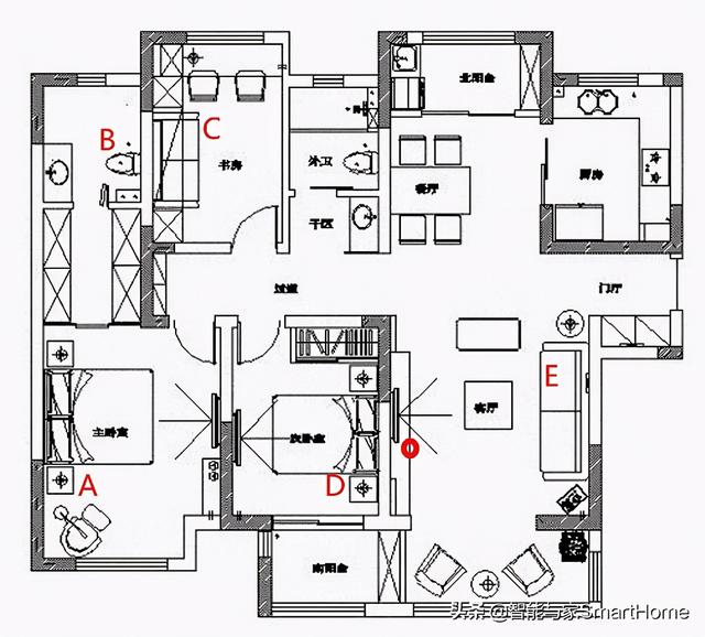 看待路由器的优劣,除了速度还有信号传输能力。小米路由器AX6000依然搭载6路外置信号放大器。按照小米官方宣传,其可以轻松实现对于大三居的覆盖。事实真的如此吗?我们的测试环境为110平米的三室一厅,我们按照家庭使用习惯将AX6000放在了客厅,而信号测试点选择五个,分别在主卧、主卫、书房、次卧以及客厅。测试结果如下图