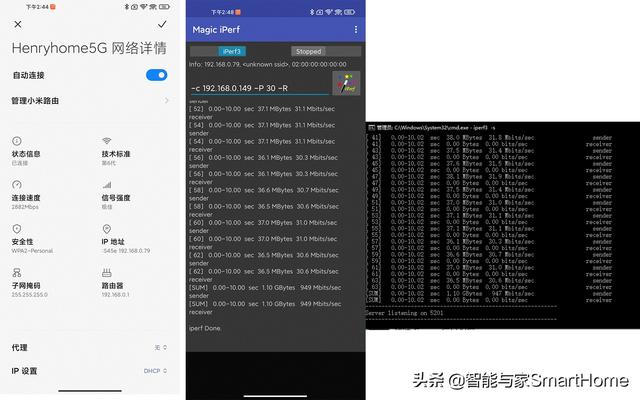 为了做对比,我首先使用仅支持WiFi 6 1024 QAM(2×2MIMO 80MHz)的K30S至尊纪念版连接AX6000,此时连接速度为1200Mbps(600Mbps×2),而内网传输速度测试为783Mbps。然后用小米11连接AX6000,此时显示连接速度为2882Mbps(1200Mbps×2×120%),而内网传输速度测试为949Mbps。可以看到在160MHz和4096 QAM等技术加持下,AX6000让小米11的WiFi性能得到很好地发挥。