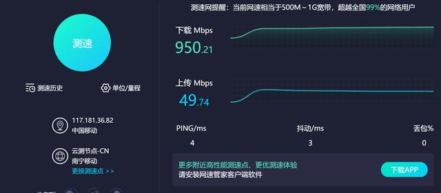 最后,等待10秒就可以上网了,我尝试重启电脑发现不用再像之前要禁用启用网络,一样能正常上网,算是一个小惊喜,本想只是让网络更稳定,没想解决了更换路由器带来的一个小问题。用SpeedTest.cn网页简单测试下行跑了950Mbps,上行你懂的只有50Mbps严重缩水,下行算是跑满了1000M,对于这次小折腾结果很满意。