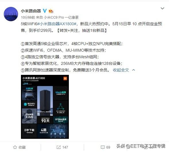 此前小米发布了一款Wi-Fi 6路由器,型号为AX3600,售价599元,在当时算是Wi-Fi 6路由器的低价了。如今几个月过去了,Wi-Fi 6路由器的整体价格开始下探,小米也发布了第二款Wi-Fi 6路由器AX1800,售价299元。
