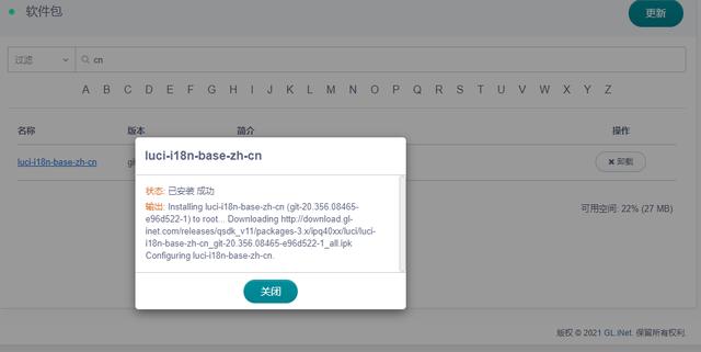 不过默认情况下luci界面是全英文的,我们需要在软件包界面安装luci-i18n-base-zh-cn这个语言包,安装成功后进入luci界面,直接就是中文界面了。