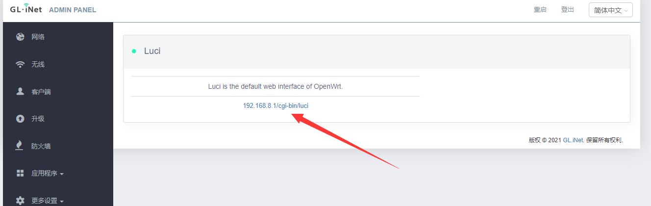 安装完成之后,如图所示。点击如图所示网址进入luci界面,如下图所示。