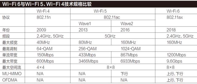 在以往的Wi-Fi协议中,比如802.11ac提供了对多个无线接入用户采用空间分隔(MU-MIMO)或者时间分隔(轮流传输/EDCA)的方式支持,而OFDMA意味着Wi-Fi 6增加了另外一种多用户资源分配方式—频分。另一个亮点则是Wi-Fi 6可以支持8×8 MIMO,所以目前Wi-Fi 6的最高理论速度可以达到9.6Gbps(8×8 MIMO@160MHz),而在其他典型的不同组合MIMO和频宽下,理论速度则分别为2.4Gbps(4×4 MIMO@80MHz)、4.8Gbps(8×8 MIMO@80MHz)和4.8Gbps(4×4 MIMO@160MHz)。