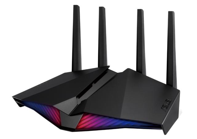 华硕RT-AX82U采用流线型机身设计,尾部是四根外置天线。机身前面的背光,支持Aura RGB灯效,可以自定义各种颜色和模式。RT-AX82U提供了满血Wi-Fi 6支持,包括4×4 MU-MIMO、160MHz频宽与1024QAM技术,无线传输速度分别为574Mbps(2.4GHz)和4804Mbps(5GHz)。