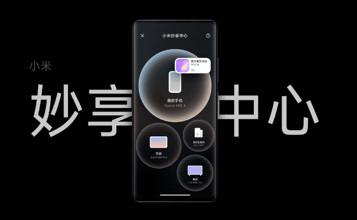 首先就是小米“妙享中心”,通过将内容卡片拖动到设备区块上,就能让音乐、视频在设备之间进行流转。