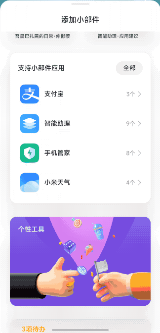 在小组件选项中,小米还将一些应用适配过的小组件放到这个选项当中,只不过想要使用,我们需要先安装App,才能正常使用小组件。
