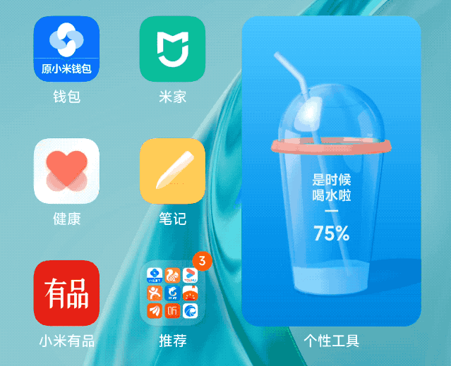 再比如“喝水量杯”,相信很多朋友在工作或者学习的时候,基本会忘记喝水这件事,这个小组件就可以让我们拿起手机的时候记得随时喝水,保持身体健康。