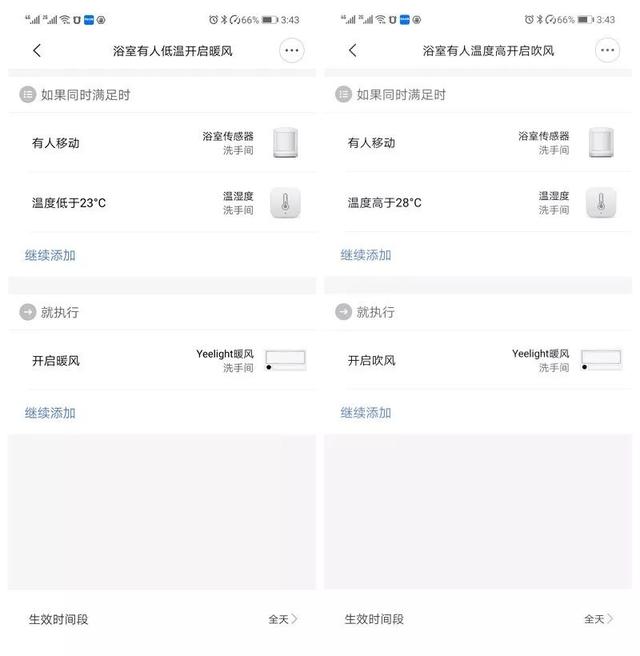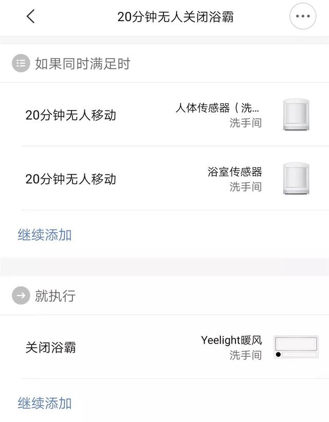 2、利用温湿度传感器和人体传感器的配合可以让智能浴霸从鸡肋变成真香,注意设置关闭浴霸时只能全部关闭或者留下灯光。